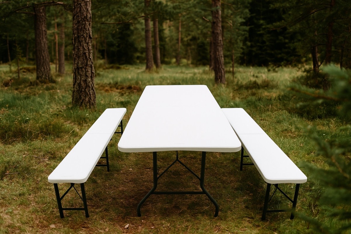 Zestaw ogrodowy lub kempingowy z plastiku – solidny, odporny i gotowy do natychmiastowego użycia. Składane ławki i stół z trwałego tworzywa sztucznego sprawdzą się wszędzie. Ten praktyczny zestaw piwny zawiera dwie ławki i jeden stół, dzięki czemu masz od razu kompletne miejsce do siedzenia dla większej liczby osób.