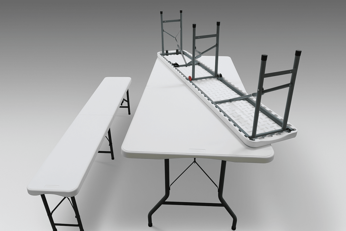 Zarówno plastikowa składana ławka, jak i plastikowy składany stół posiadają prosty system składania. Po złożeniu zajmują bardzo mało miejsca, co docenisz podczas transportu samochodem lub przechowywania.